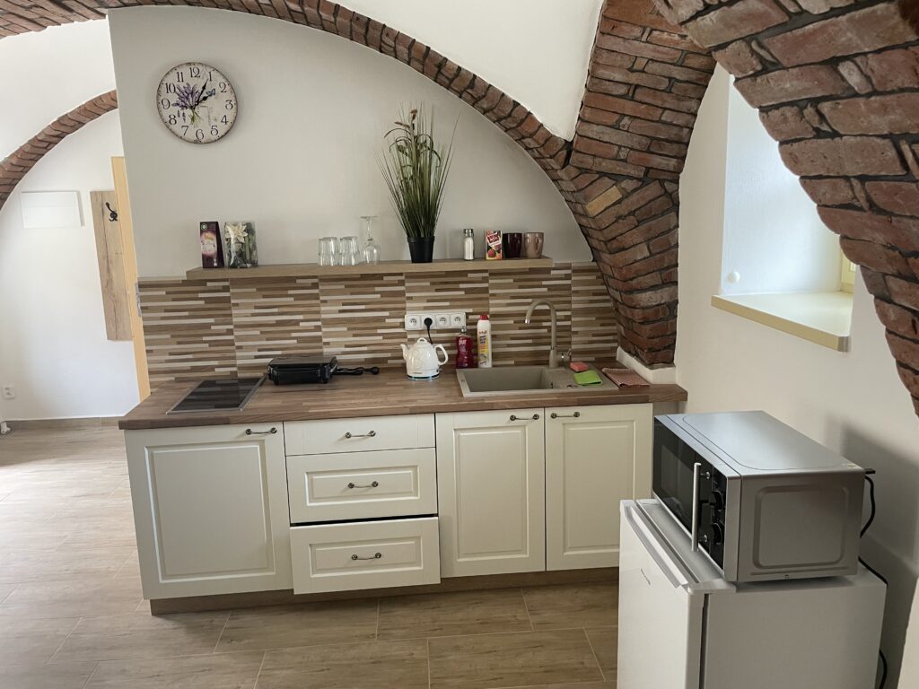 Vybavená sklokeramickou deskou, varnou konvicí, lednicí a potřebným nádobím.