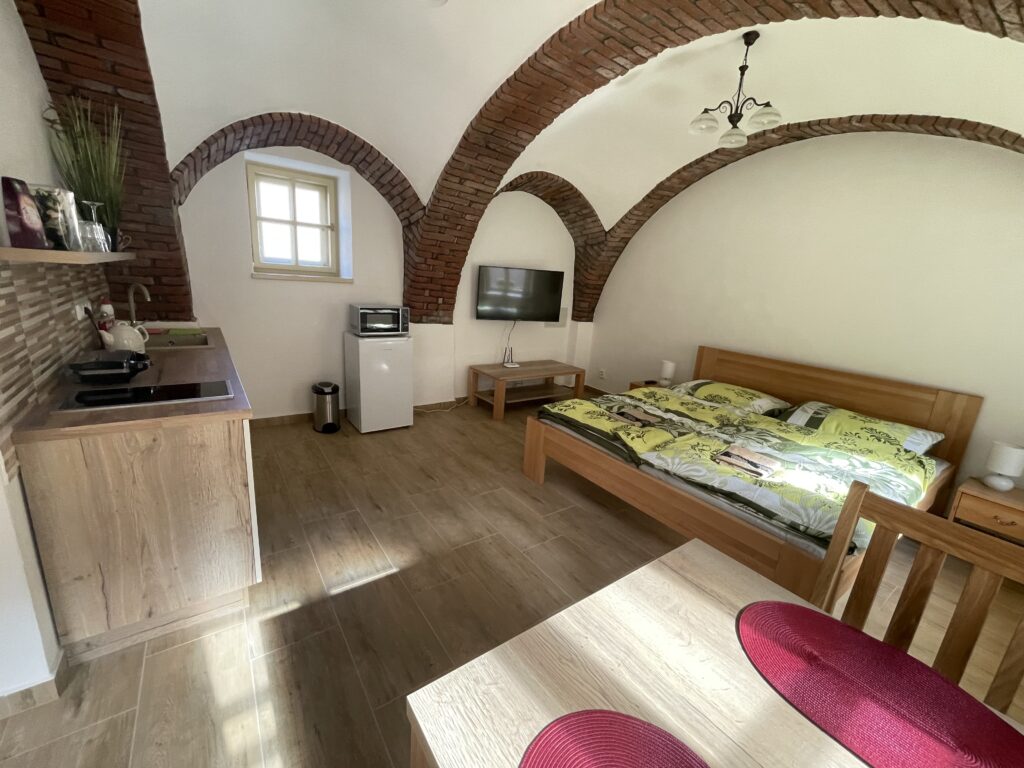 V zadní části chalupy je samostatné apartmá s manželskou postelí, kuchyňkou, jídelním stolem a koupelnou. Je možné přidat také dětskou postýlku. Apartmá je odděleno od přední části.